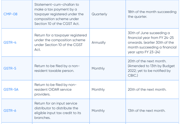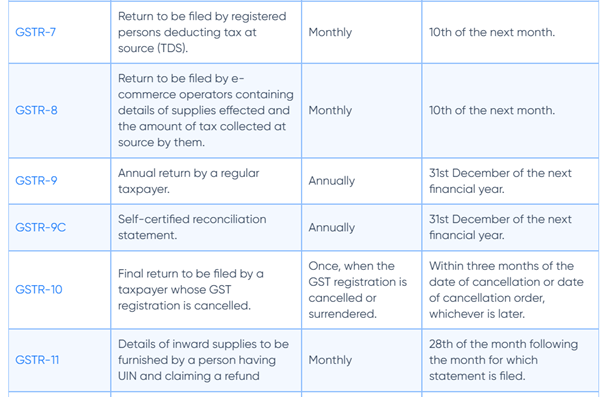 Here is a list of all the returns to be filed as prescribed under the GST Law along with the due dates.